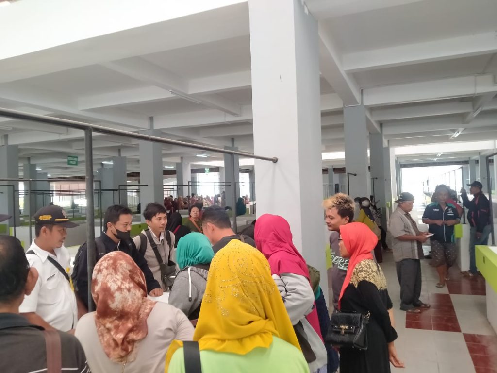 Bojonegoro – Ratusan pedagang lesehan pasar lama berjajar rapi di Pasar Wisata Bojonegoro. Mereka antre sesuai zonasi dagangan untuk mendapatkan undian penempatan stan baru di Pasar Wisata, Senin (2/1/2023). Sesuai rencana, tanggal 10 Januari mendatang pedagang pindah ke Pasar Wisata.