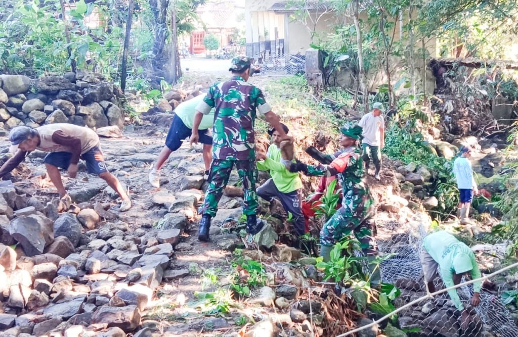 BOJONEGORO, – Jajaran Bintara Pembina Desa (Babinsa) Posramil 19/Gondang Kodim 0813 Bojonegoro, bersama Pemerintah Desa dan masyarakat Desa Sambongrejo melaksanakan karya bakti membangun bronjong tebing sungai untuk mencegah amblasnya tanah dikala musim penghujan, Sabtu (14/6/2025).