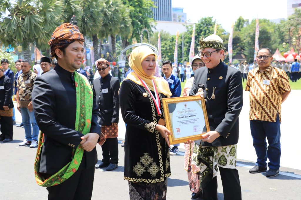 Surabaya-Kamis (12/10), dalam Upacara Peringatan Hari Jadi Provinsi Jawa Timur ke-78 di Gedung Grahadi, Pemkab Bojonegoro menerima penghargaan dari Gubernur Jawa Timur dengan kategori Kabupaten yang berkomitmen dalam melestarikan dan mengembangkan Sumber Daya Genetik Hewan Sapi Peranakan Ongole (PO). Penghargaan tersebut diterima langsung oleh Pj. Bupati Bojonegoro yang turut mengikuti Upacara Peringatan Hari Jadi Provinsi Jawa Timur, atas kontribusi Pemkab Bojonegoro dalam keberhasilannya mengembangkan sapi peranakan ongole.