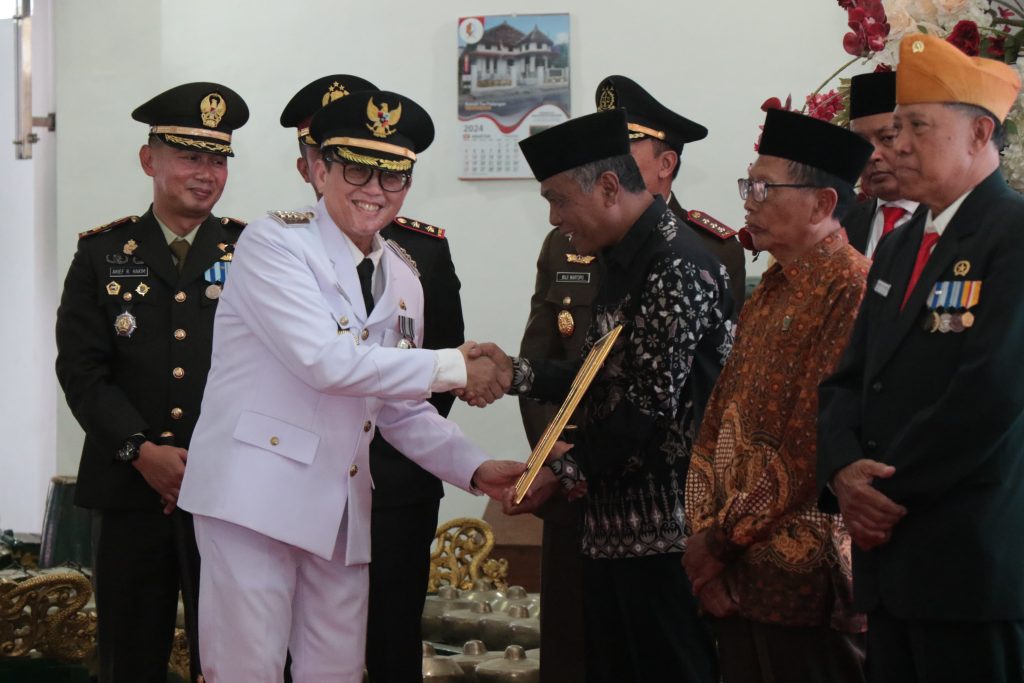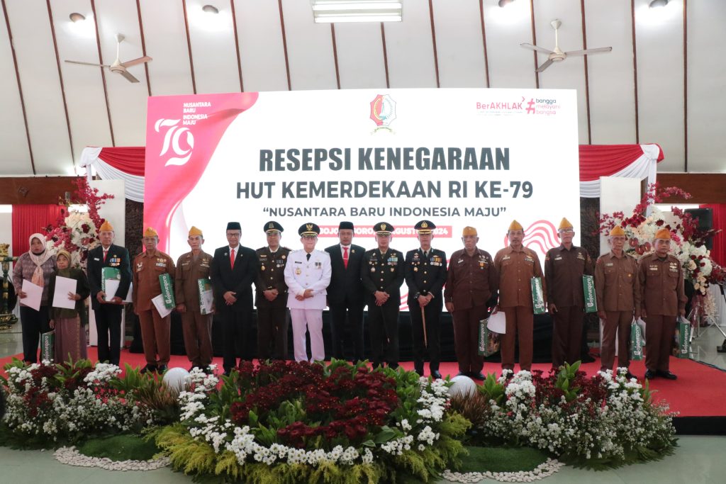 Ragamnusantara.id, Bojonegoro – Momentum memperingati HUT Ke-79 Kemerdekaan RI tahun 2024, Penjabat Bupati Bojonegoro Adriyanto persembahkan tali asih dan penghargaan ke sejumlah tokoh pejuang kemerdekaan RI, tokoh masyarakat, serta insan berprestasi Kabupaten Bojonegoro. Penghargaan diberikan dalam rangkaian resepsi kenegaraan dan upacara peringatan detik-detik proklamasi yang diikuti secara live streaming dari Ibu Kota Nusantara (IKN) di Pendopo Malowopati Sabbtu, 17 Agustus 2024.