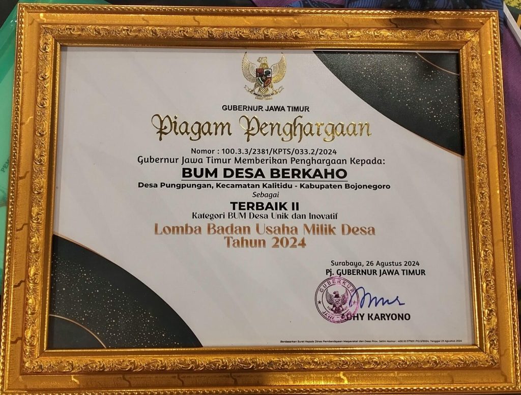 Bojonegoro, – Badan Usaha Milik Desa (BUM Desa) Berkaho yang terletak di Desa Pungpungan, Kecamatan Kalitidu, berhasil meraih juara kedua dalam kategori unik dan inovatif pada lomba BUM Desa Provinsi Jawa Timur 2024. Pengumuman pemenang dilakukan di Hotel Quest Surabaya, dalam acara Temukarya Pemenang Lomba Video Kreatif Usaha Ekonomi Perdesaan dan BUM Desa Terbaik.(11/10/2024).