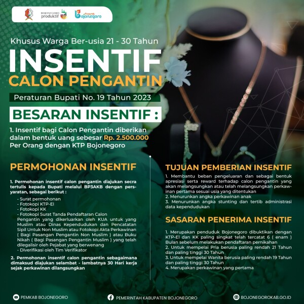 Besaran insentif yang diberikan adalah Rp 2.500.000 per orang dengan KTP Bojonegoro. Permohonan insentif calon pengantin harus diajukan secara tertulis kepada Bupati melalui Dinas Pemberdayaan Perempuan, Perlindungan Anak, dan Keluarga Berencana (DP3AKB) dengan melampirkan surat permohonan, fotokopi KTP-el, fotokopi KK, fotokopi surat tanda pendaftaran calon pengantin dari KUA/Dinas Kependudukan dan Pencatatan Sipil, atau fotokopi akta perkawinan/buku nikah yang telah dilegalisir oleh pejabat yang berwenang. Permohonan harus diverifikasi oleh tim verifikator dan diajukan selambat-lambatnya 30 hari kerja setelah perkawinan dilangsungkan.