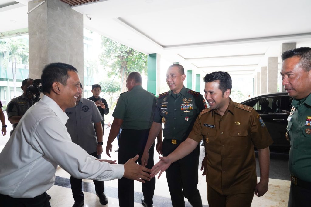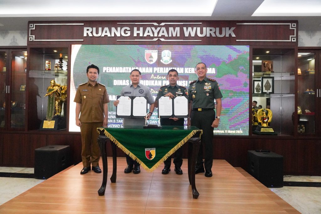 Surabaya, – Bupati Bojonegoro Setyo Wahono di dampingi Dandim 0813 Arif Rachman Hakim menghadiri acara Penandatangan Perjanjian Kerjasama antara Dinas Pendidikan Provinsi Jawa Timur dengan TNI Angkatan Darat Kodam V Brawijaya, tentang Peningkatan Pendidikan dan Kualitas SDM dalam Penerapan Kurikulum Khusus Bela Negara dan Kesamaptaan pada SMAN 5 Taruna Brawijaya Kediri dan SMAN 2 Taruna Pramongpraja Bojonegoro. Selasa Pagi, (11/3/2025) di Kodam V Brawijaya Surabaya.