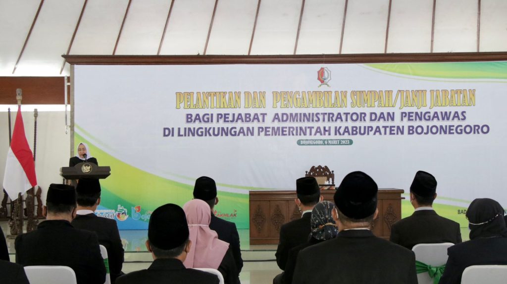 Bojonegoro – Bupati Bojonegoro melantik 27 Pejabat lingkup Pemerintah Kabupaten Bojonegoro, Senin (6/03/23) di Pendopo Malowopati. Dalam acara yang turut diikuti oleh Staf Ahli dan Asisten Daerah, Anna Mu’awanah meminta agar seluruh Pejabat Untuk netral di tahun politik sekarang ini.