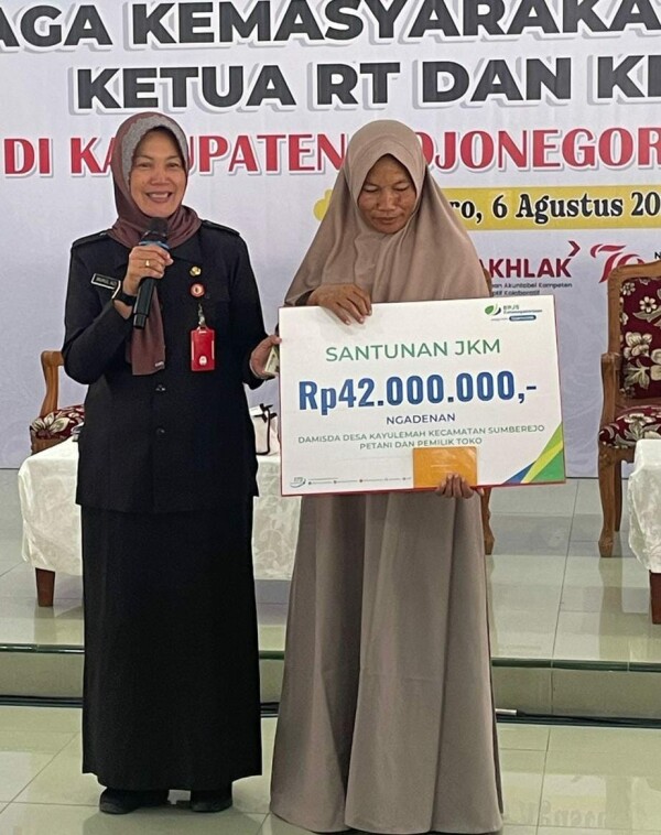 Pada hari ini, juga diserahkan santunan kematian dari BPJS Ketenagakerjaan kepada pekerja rentan yang diserahkan secara simbolis kepada ahli waris dari Bapak Ngadenan Desa Kayulemah Kecamatan Sumberrejo senilai Rp. 42 juta.(sr/rn)