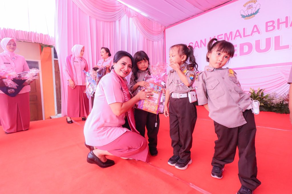 Tampak dilokasi, Wakil Ketua Bhayangkari Daerah Jawa Timur, Ny. Vitha Pasma Royce, Wakil Ketua Pengurus Yayasan Kemala Bhayangkari Daerah Jawa Timur, Ny. Anti Ary Satriyan didampingi Ketua PYKB Cabang Bojonegoro, Ny. Nea Mario Prahatinto langsung menyapa siswa siswi TK Kemala Bhayangkari 96 sekaligus menyalurkan program Makan Bergizi Gratis (MBG) dan buku, alat tulis kepada siswa siswi TK Kemala Bhayangkari 96, serta bantuan sosial kepada guru dan karyawan sekolah.