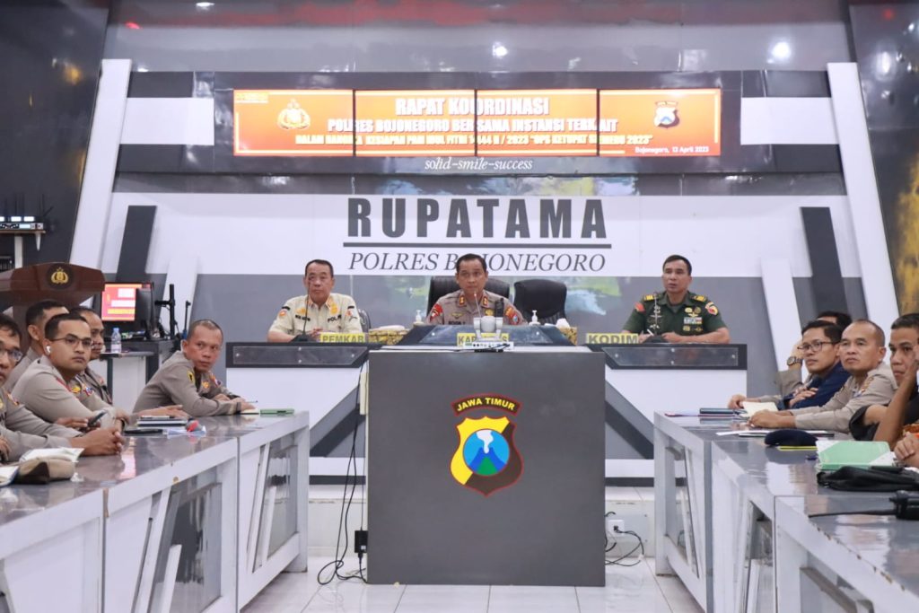 Bojonegoro – Jelang Hari Raya Idul Fitri 1444 H/2023, Polres Bojonegoro bersama seluruh jajaran Forum Koordinasi Pimpinan Daerah (Forkopimda) Kabupaten Bojonegoro menggelar Rapat Koordinasi (Rakor) lintas sektoral Operasi Ketupat Semeru 2023 di Gedung AP I Rawi, Polres Bojonegoro, Kamis(13/4/2023).