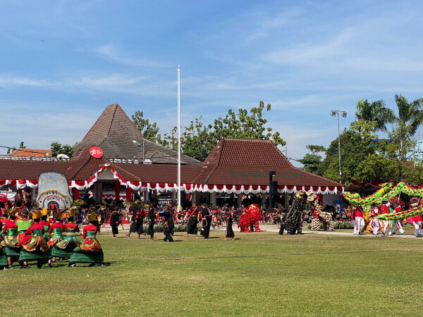 Bojonegoro – Penampilan kolaborasi berbagai unsur budaya Bojonegoro menjadi suguhan spektakuler bagi tamu undangan dan warga sekitar pada pra acara upacara HUT Ke-78 Kemerdekaan Republik Indonesia yang digelar oleh Pemerintah Kabupaten Bojonegoro. Upacara dipimpin langsung Bupati Bojonegoro Anna Mu’awanah di alun-alun Kabupaten Bojonegoro, Kamis (17/8/2023).