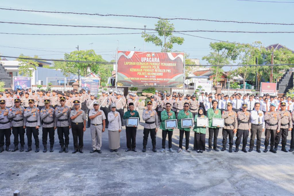 Bojonegoro, – Kapolres Bojonegoro AKBP Afrian Satya Permadi, SH, SIK, MIK memberikan penghargaan kepada enam warga berprestasi dalam sebuah upacara di halaman Mapolres Bojonegoro, Senin (29/9/2025).