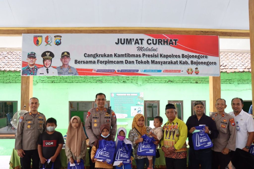 Kegiatan Jum’at Curhat dilanjutkan pemberian santunan kepada anak yatim piatu oleh Kapolres Bojonegoro dan kemudian sesi tanya jawab oleh peserta/tamu undangan.(sr/rn)