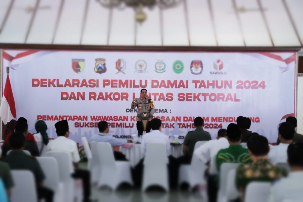 Bojonegoro – Sebagai wujud dukungan terciptanya Pemilu damai dan aman, Kapolres Bojonegoro, AKBP Rogib Triyanto, SIK menghadiri Deklarasi Pemilihan Umum (Pemilu) Damai 2024 di Pendopo Malowopati Pemerintah Kabupaten (Pemkab) Bojonegoro, Jalan Mastumapel Kota Bojonegoro, Rabu(8/11/2023).