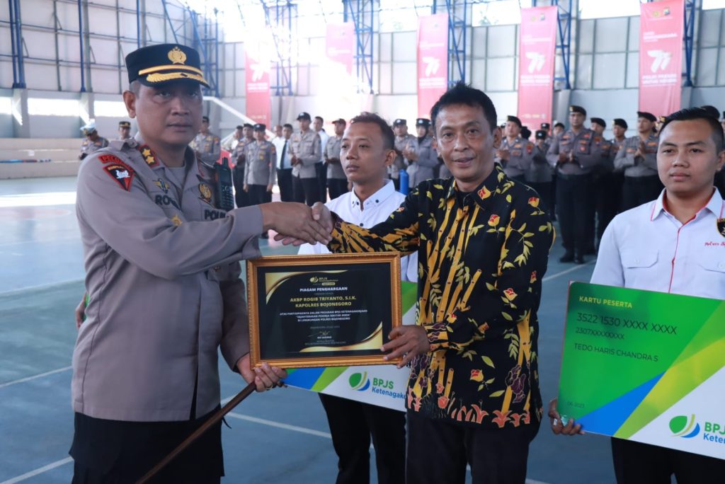 Bojonegoro – Kapolres Bojonegoro, AKBP Rogib Triyanto, SIK memimpin apel penyerahaan kartu Badan Penyelenggara Jaminan Sosial (BPJS) ketenagakerjaan kepada perwakilan Tenaga Harian Lepas (THL) Polres Bojonegoro di Gelanggang Olah Raga (GOR) Mapolres Bojonegoro, Kamis(20/7/2023).