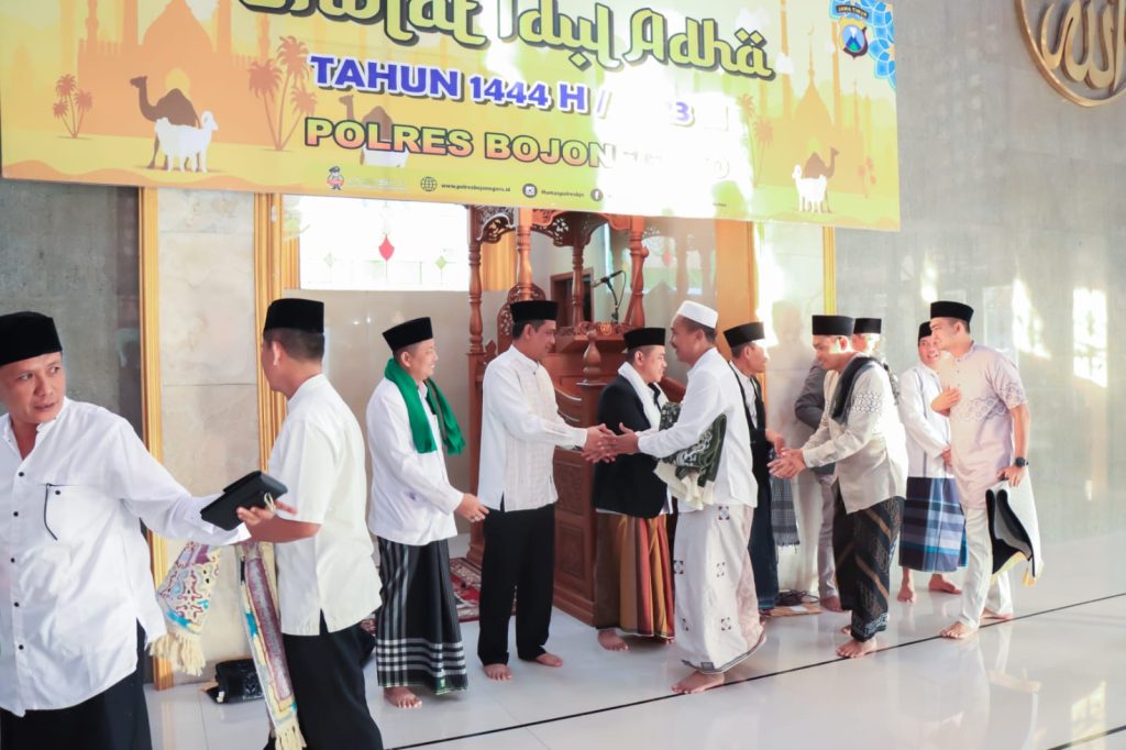 Bojonegoro – Dalam rangka menyambut Hari Raya Idul Adha 1444 Hijriyah, Kapolres Bojonegoro AKBP Rogib Triyanto, SIK melaksanakan Sholat Idul Adha bersama di Masjid Al Ikhlas Polres Bojonegoro, dengan bertindak sebagai Khotib yakni Kepala Kantor Kementerian Agama Kabupaten Bojonegoro, H. Abdul Wahid, S.Ag., M.Pd.I., Kamis (29/06/2023).