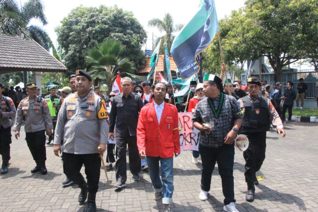 Tuban – Kapolres Tuban AKBP William Cornelis Tanasale, S.I.K., pimpin pelaksanakan pengamanan penyampaian aspirasi damai yang digelar oleh Himpunan Mahasiswa Islam (HMI) dan Gerakan Mahasiswa Nasional Indonesia (GMNI) Tuban di depan kantor DPRD Kabupaten Tuban.