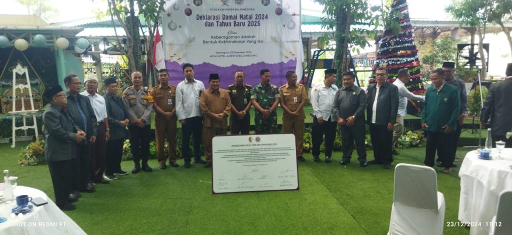 Bojonegoro – Dalam rangka menyambut perayaan Natal 2024 dan Tahun Baru 2025, Kapolsek Bojonegoro Kota, AKP Agus Elfauzi, menghadiri acara Deklarasi Damai Natal 2024 dan Tahun Baru 2025 yang digelar oleh Forum Kerukunan Umat Beragama (FKUB) Bojonegoro di Hotel dan Resto MCM jalan Pemuda Kecamatan Kota Bojonegoro, pada Senin, (23/12/2024) siang.