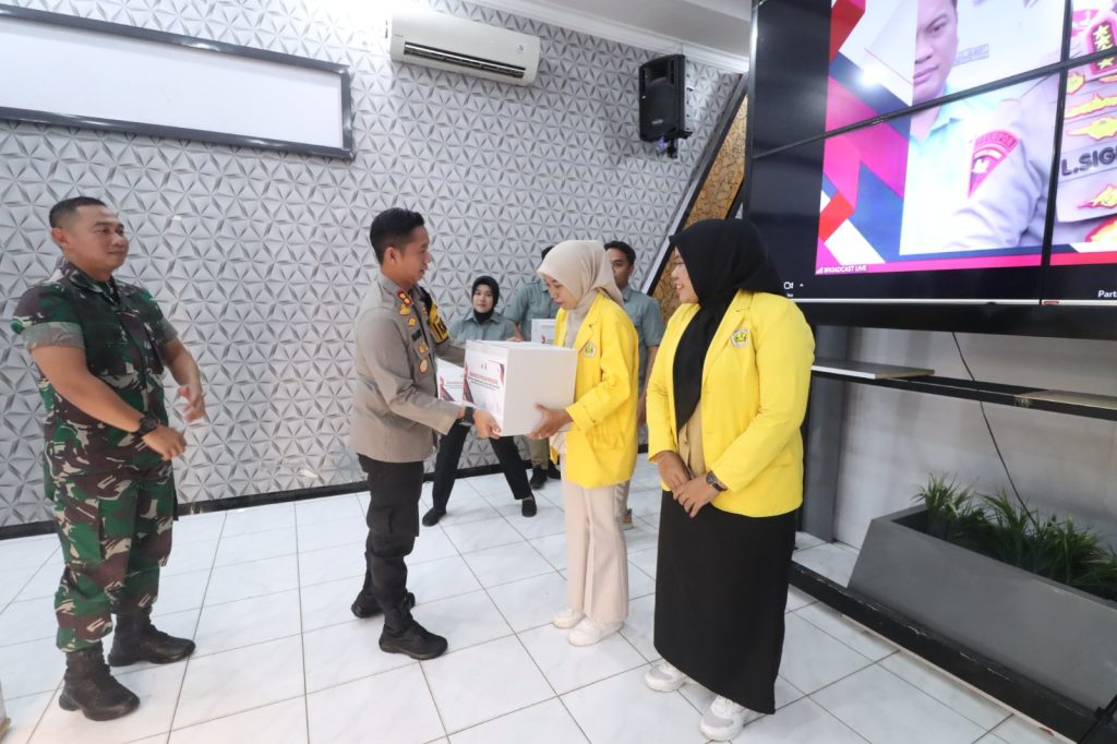 Selesai zoom meeting, Kapolres Bojonegoro Bersama Dandim 0813/Bojonegoro menyalurkan bantuan sosial (bansos) secara simbolis kepada perwakilan mahasiswa, BEM dan OKP.