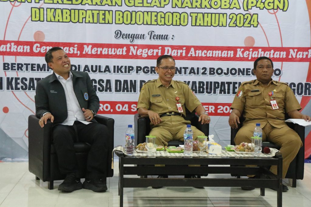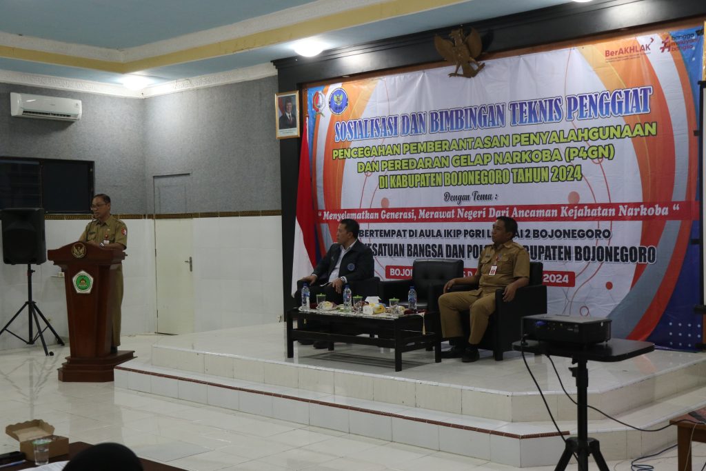 Selaras dengan program nasional tersebut, Senin 04/11/2024, Pemerintah Kabupaten Bojonegoro melalui Badan Kesatuan Bangsa Dan Politik selenggarakan Sosialisasi Dan Bimbingan Teknis Penggiat Pencegahan Pemberantasan Penyalahgunaan Dan Peredaran Gelap Narkoba (P4GN) bertempat di Aula IKIP PGRI Bojonegoro. Mengangkat tema “Menyelamatkan Generasi, Merawat Negeri Dari Ancaman Kejahatan Narkoba”, sosialisasi menghadirkan Plh Kepala BNNK Tuban Masduki, S.H, MH, Perwakilan Forkopimda, Pj Sekda Djoko Lukito, Kepala Bakesbangpol Mahmudi, Penggiat P4GN Bojonegoro, dan ormas.