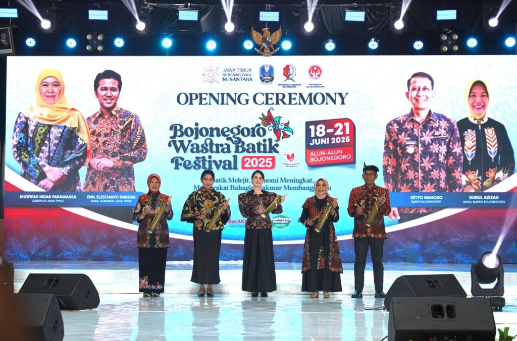 Bojonegoro – Medhayoh Bojonegoro, hadir di Alun-Alun Bojonegoro (18/6) Ketua Dekranasda Provinsi Jawa Timur Ibu Arumi Bachsin Emil Dardak, Wakil Wali Kota Surakarta Ibu Hj. Astrid Widayani, Pangkoarmada II/Ketua Jalasenastri Armada II, Ibu Yully Alit Jaya, didampingi Bupati Bojonegoro, Wakil Bupati Bojonegoro dan Ketua Dekranasda Bojonegoro, Ibu Cantika Wahono serta Kepala Daerah dan Perwakilan Kepala Daerah dari berbagai daerah di Jawa Timur dan Jawa Tengah dalam Opening Ceremony Bojonegoro Wastra Batik Festival 2025 yang digelar secara meriah.