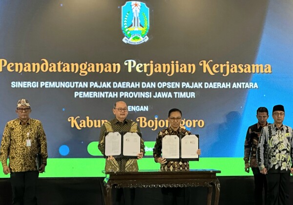 Bojonegoro, – Pemerintah Kabupaten Bojonegoro menandatangani Perjanjian Kerja Sama (PKS) sinergi pemungutan pajak daerah dan opsen pajak daerah dengan Pemerintah Provinsi Jawa Timur, Senin (2/12/2024) di Hotel Bumi Surabaya. PKS ini juga diikuti oleh Pemerintah Kab/Kota se-Jawa Timur.