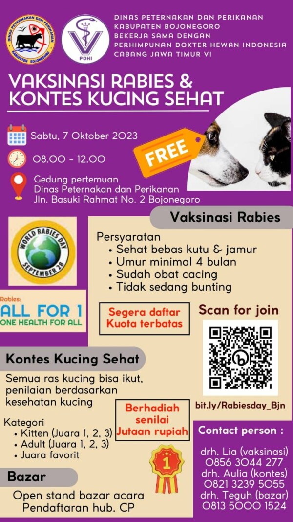 Kepala UPTD Puskeswan drh. Indra Firmansyah mengatakan pelaksanaan vaksinasi rabies dan kontes kucing akan dilaksanakan di Gedung Pertemuan dan halaman Kantor Disnakkan Bojonegoro. Para peserta dapat mendaftar terlebih dahulu untuk mendapatkan kuota karena vaksin yang disediakan terbatas.