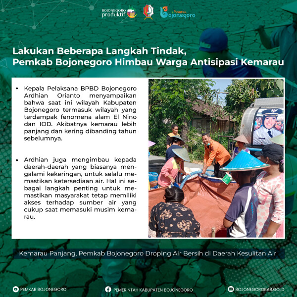 Dengan demikian, langkah-langkah ini diharapkan dapat membantu masyarakat tetap memiliki akses terhadap sumber air yang cukup dan mengurangi dampak negatif dari fenomena alam El Nino yang sedang berlangsung. Masyarakat juga diimbau untuk menghubungi BPBD Kabupaten Bojonegoro apabila membutuhkan pasokan air bersih lebih lanjut. Semua langkah ini ditempuh demi menjaga stabilitas dan kesejahteraan selama musim kemarau yang berat ini. (sr/rn/lis)