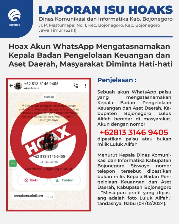 Kepala Dinas Komunikasi dan Informatika Kabupaten Bojonegoro Siswoyo memastikan nomor WhatsApp tersebut bukanlah milik Kepala BPKAD Kabupaten Bojonegoro Luluk Alifah. Terlebih akun WhatsApp tersebut terdaftar sebagai akun bisnis yang bergabung pada bulan lalu.