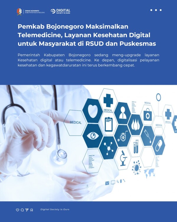 Dinkes Bojonegoro telah menyiapkan tiga layanan telemedicine. Pertama pengembangan sistem antrean layanan dari empat RSUD melalui satu nomer WhatsApp. Kedua, reaktivasi hotline WhatsApp puskesmas. Ketiga, integrasi layanan Siaga Bro PSC 119 dengan Dinas Pemadam Kebakaran dan Penyelamatan (Damkar) dan Badan Penanggulangan Bencana Daerah (BPBD)