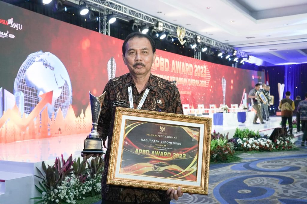 Jakarta- Pemerintah Kabupaten Bojonegoro kembali menerima penghargaan dari Pemerintah Pusat, Kamis pagi ini (16/3), bertempat di Hotel Mercure Convention Centre Ancol Jakarta Utara, Pemkab Bojonegoro terima penghargaan dari Kementerian Dalam Negeri (Kemendagri) Republik Indonesia sebagai Pemerintah Daerah kategori Realisasi Pendapatan Daerah Tertinggi APBD Tahun 2022 peringkat pertama tingkat Kabupaten Se Indonesia yang di terima oleh Kepala Bapenda Bojonegoro M. Ibnu Soeyoeti.