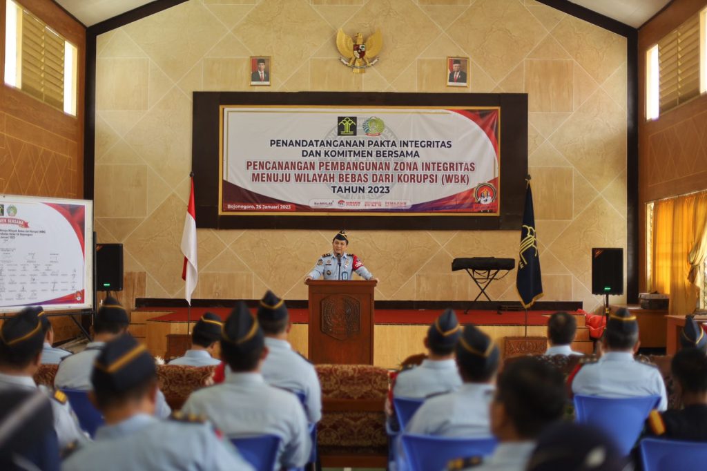 Bojonegoro – Jajaran Lembaga Pemasyarakatan (Lapas) Kelas IIA Bojonegoro Kemenkumham Jatim melaksanakan Pencanangan Pembangunan Zona Integritas (ZI) menuju Wilayah Bebas dari Korupsi (WBK), Rabu (25/1/2023).