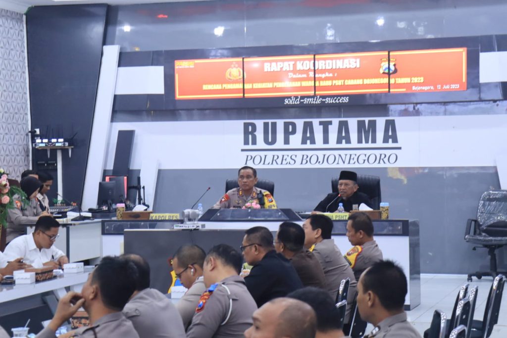 Bojonegoro – Polres Bojonegoro mengadakan Rapat Koordinasi (Rakor) untuk merencanakan pengamanan pengesahan warga baru Setia Hati Terate (SHT) Cabang Bojonegoro Pusat Madiun di Gedung AP I Rawi Polres Bojonegoro pada Rabu (12/7/2023).