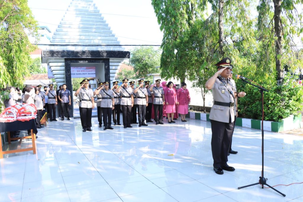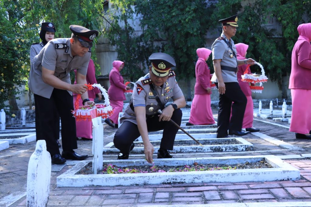 Upacara ziarah dan tabur bunga di TMP Kota Bojonegoro dipimpin oleh Kapolres Bojonegoro, AKBP Rogib Triyanto, SIK. Turut hadir dalam acara tersebut adalah Pejabat Utama Polres Bojonegoro, Kapolsek Kota, perwakilan anggota Polri, Aparatur Sipil Negara (ASN) Polres Bojonegoro, ibu Ketua Bhayangkari Cabang Bojonegoro Ny. Sulis Rogib Triyanto beserta pengurus.