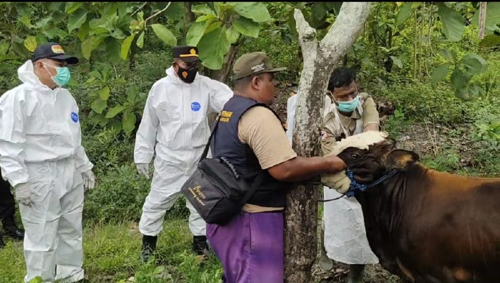 Sementara itu, petugas gabungan mendatangi kandang hewan ternak dan melakukan pemeriksaan hewan ternak oleh tim medis.