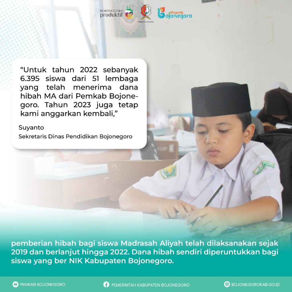 “Untuk tahun 2022 sebanyak 6.395 siswa dari 51 lembaga yang telah menerima dana hibah MA dari Pemkab Bojonegoro. Tahun 2023 juga tetap kami anggarkan kembali,” jelasnya.