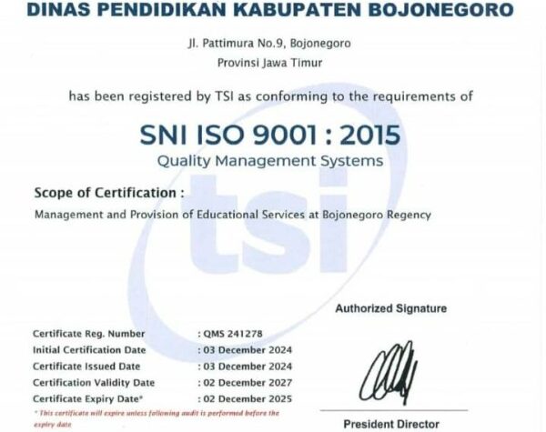 Bojonegoro, – Dinas Pendidikan Kabupaten Bojonegoro meraih Sertifikat ISO 9001:2015. Sertifikat ini merupakan pengakuan resmi...