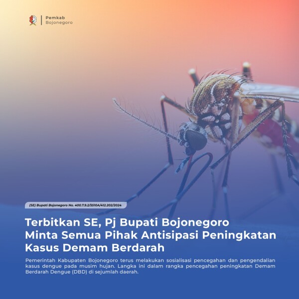 Lebih lanjut, dalam SE tersebut, dijelaskan bahwa kasus DBD di Kabupaten Bojonegoro dari Januari sampai dengan 20 Oktober 2024 sebanyak 470 kasus (incidence rate 35 per 100.000 penduduk) dan 4 kasus kematian (case fatality rate 0,85%. Peningkatan kasus DBD ini diperkirakan masih akan berlanjut pada musim penghujan.