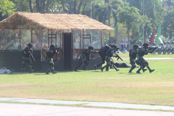 Peragaan demonstrasi ketangkasan prajurit TNI yang mendapatkan atensi dari peserta upacara di antaranya demonstrasi Bela Diri Militer (BDM), Pertempuran Jarak Dekat (PJD), dan snapling Hadir dalam kegiatan ini, Dandim 0813, Pj Bupati Bojonegoro didampingi sekretaris daerah, forkopimda, dan ketua DPRD. Para pejabat tersebut menaiki mobil Panser Anoa menuju lapangan upacara. Hadir pula pasukan gabungan yang terdiri dari Polri, Brimob, BPBD, Damkar, Linmas, PNS Kodim, mahasiswa, siswa, IPSI, serta tamu undangan.