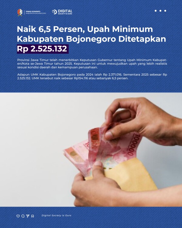 Adapun UMK Kabupaten Bojonegoro pada 2024 ialah Rp 2.371.016. Sementara 2025 sebesar Rp 2.525.132. UMK tersebut naik sebesar Rp154.116 atau sebanyak 6,5 persen.